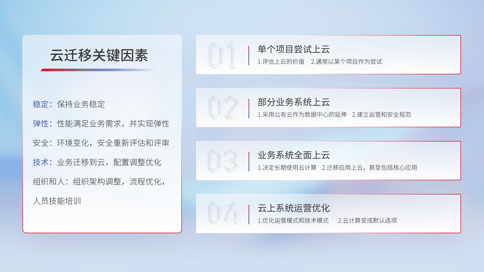 结合实际业务,,从规划设计、、、、云平台选型、、云原生改造、、、、数据迁移、、集成交付,,,迁移全过程为客户识别最佳上云路径,,做好风险识别管理,,,,设计网络架构、、身份权限、、、、安全审计合规、、操作审计、、、、日志审计、、、监控告警策略、、、、多站点容灾设计等,,对云上基础设施进行整体规划,,提升IT治理水平,,以满足弹性、、、、高可用、、、、高性能的需求。。