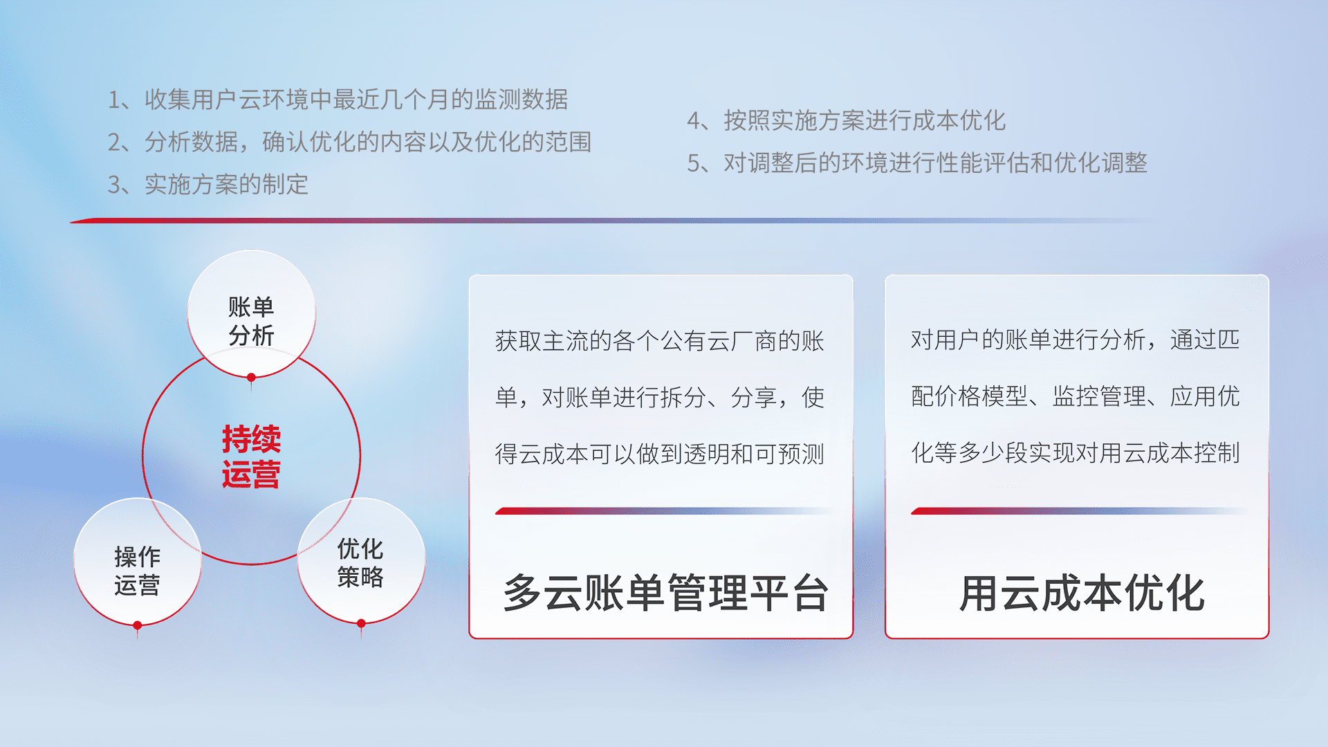 通过多云纳管,,以统一的资源数据模型把客户的云资源进行抽象和封装,,,进而实现对多云资源的统一操作,,,保障云资源管理的可靠性、、稳定性与可用性。。。。量身定制化运维内容,,,配置、、、、开发运维、、、、补丁管理、、、备份、、、、监控、、、认证和访问管理、、、审计和日常巡检等,,保障在用云过程中的可靠度,,,,稳定度以及高可用率。。。