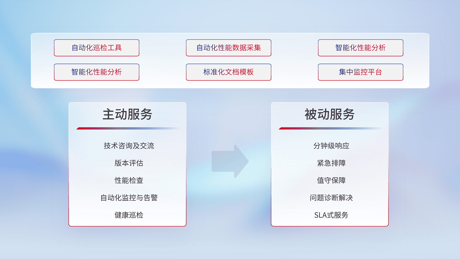 智能化工具和标准化文档,,,保障服务质量,,提供主动服务(包含技术咨询、、、版本评估、、、性能检查、、、、自动化监控与告警、、健康巡检)和被动服务包含(分钟级响应、、紧急排障、、、、值守保障、、、、问题诊断解决、、SLA服务)。。